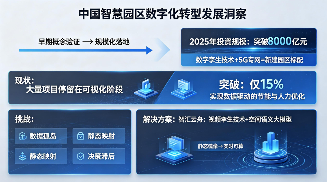 智慧园区正从"单点数字化"向"全局智慧化"迈进。作为新基建的重要载体,智慧园区承载着城市智能化的核心使命。而在这一变革浪潮中,成为了空间智能应用引领者智汇云舟,正在重塑我们对城市空间的认知与管理模式。